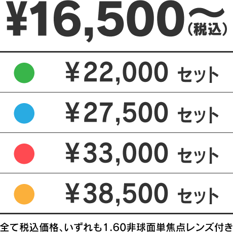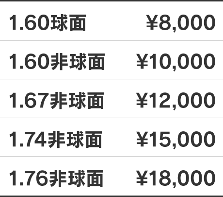 レンズのみの販売は1.60球面レンズ1組を8,000円からご用意しております